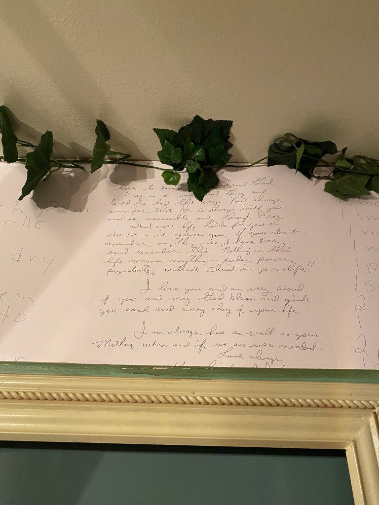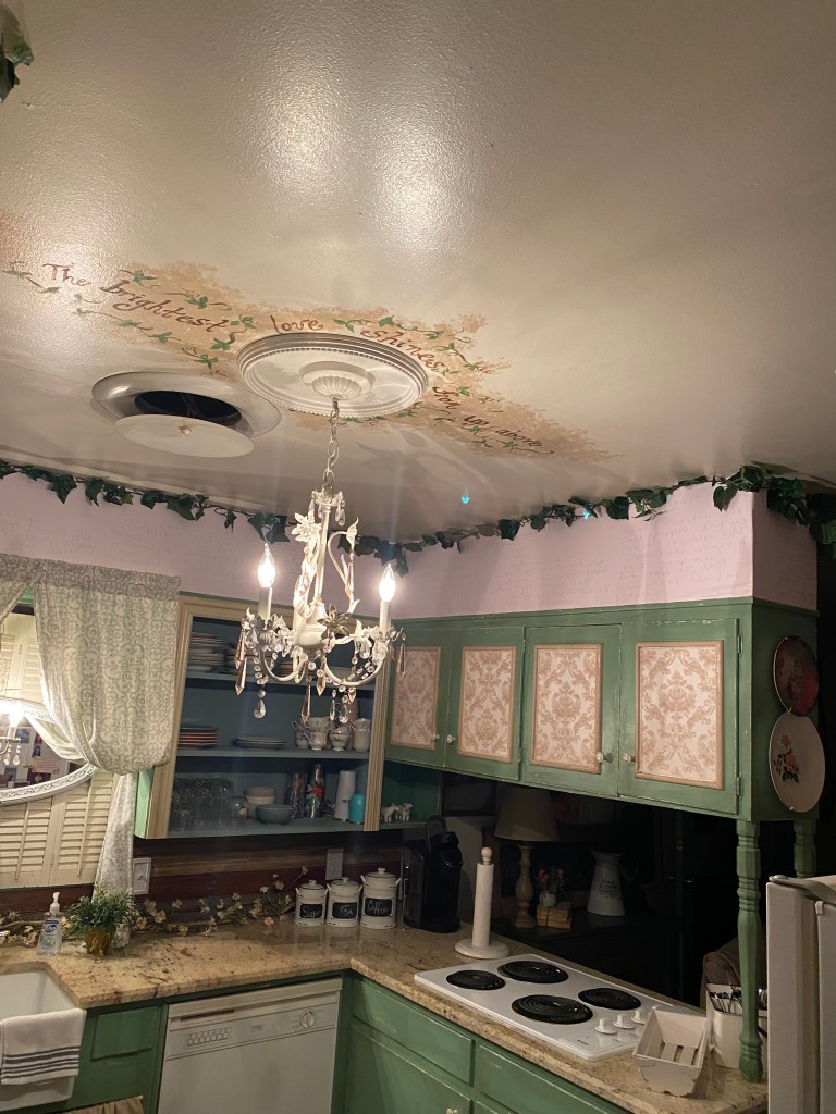 One of the projects I wanted to do in my kitchen involved somehow preserving my mom and dad’s handwriting to use as a wallpaper. I contacted my childhood friend, Cary Collins Acosta, who owns The Prickly Pear Embroidery in Ft. Stockton, Texas, and told her what I was wanting to do. She suggested a peel and stick wallpaper. I sent her copies of some recipe cards and the letter my dad had written me. She then worked her magic and created these sheets of wallpaper for me in the palest pink color with my mom’s handwritten recipes on them as well as portions of my dad’s letter. I pieced them together and now, every time I walk in my kitchen, I can see the beautiful art that is part of my history….a piece of my mom and dad. Sometimes I wish I could just rewind back to the old days and press pause…..just for a little bit.