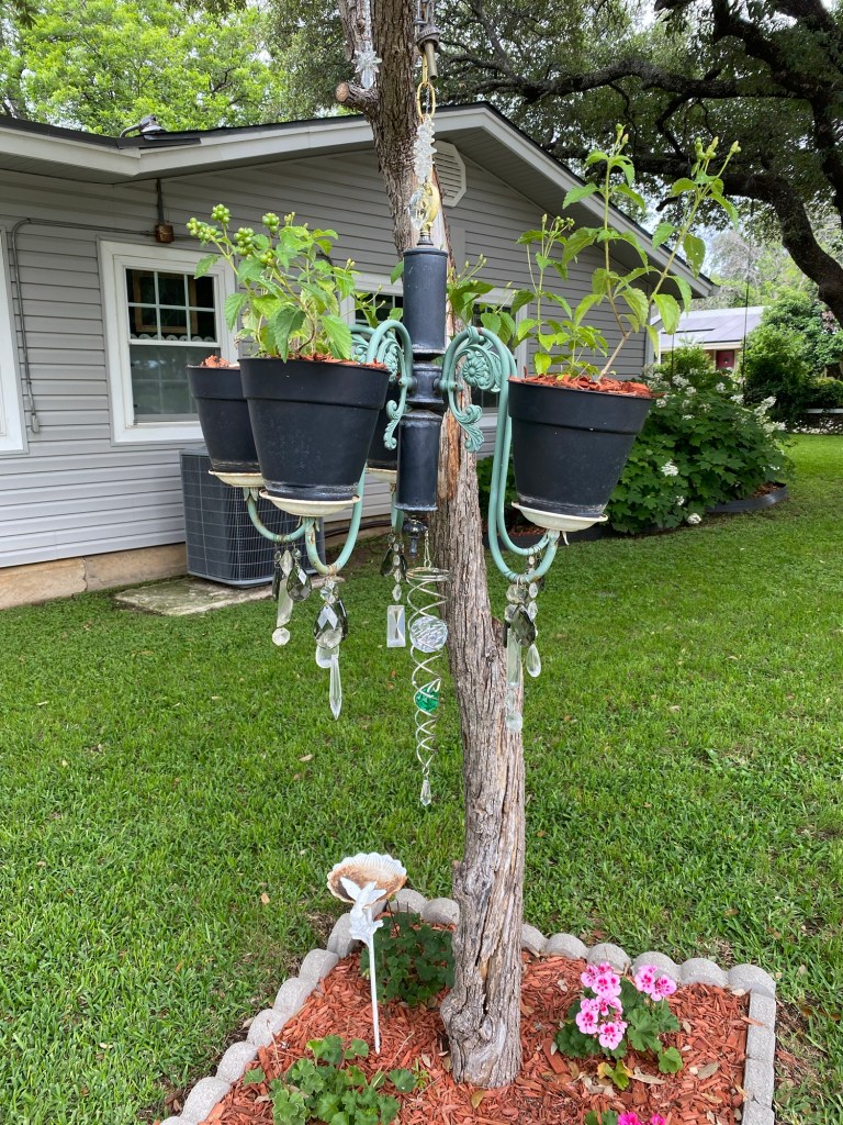 My next project was made from a chandelier that a friend was getting rid of. I took the electrical components out of it and screwed some heavy duty pots onto the places where the lights were. I spray painted it with paint I already had, and decorated it with crystals I found at a flea market for $5!!!