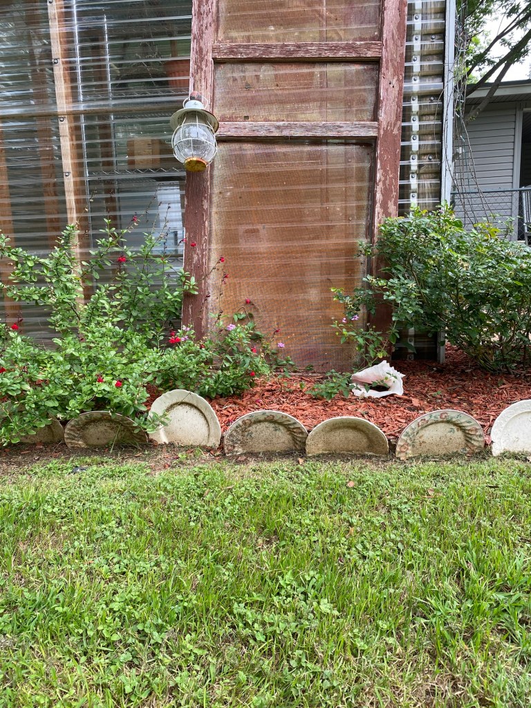 Now let me point out the precious, vintage, plate border along the flowerbeds of the greenhouse!!! This is one of my favorite things!! I was rummaging through a garage sale one Saturday and ran across all these vintage plates….FOR A PENNY EACH!!! Yep, you read that correctly!!! For a couple of bucks, I bought all of the mismatched china that was there!! I simply got my shovel and dug a trench along the outline that I desired for the bed. I went about 5 inches deep. Then I placed the plates in the trench and filled the dirt back in. I have extras just in case I clumsily fling my weed eater into one. 😆