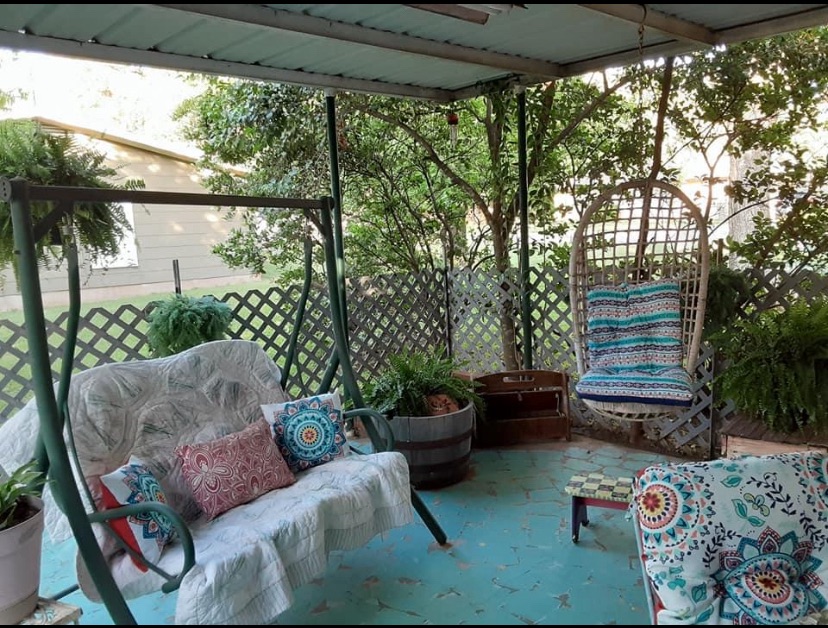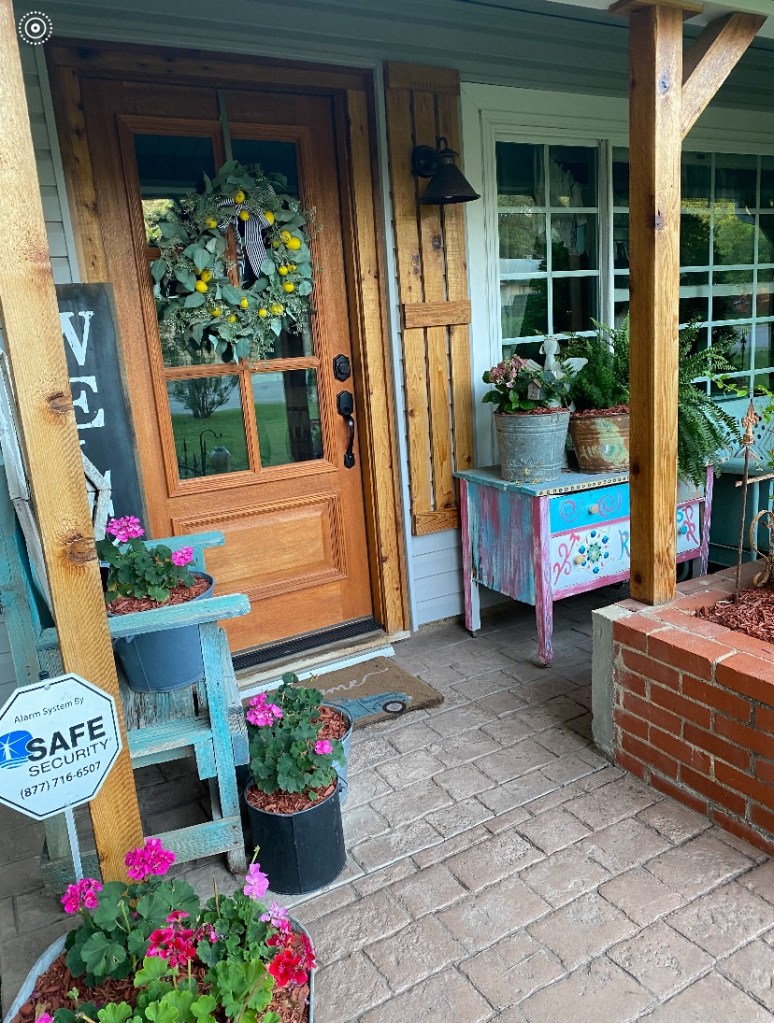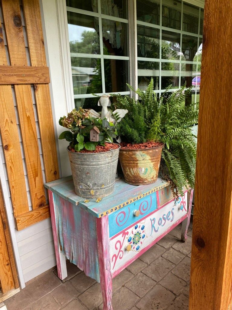 Front porches are so important as that is what gives visitors the first feel of what your home is conveying. You want it to be warm and welcoming but also neat and tidy. First impressions are important. You might even have an old dresser that could work on your porch. A friend of mine was wanting to get rid of a dresser. I didn’t have a place for it inside, but I knew I could use it somewhere. That somewhere was on my porch. I painted it some fun colors, and it holds some flower pots as well as some garden figures.